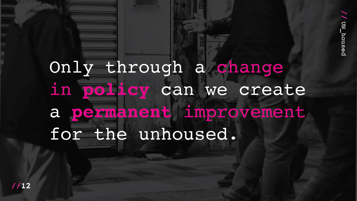 UN_housed is my capstone project focusing first and foremost on reframing the idea of homelessness as the fault of the individual to individuals who have been failed by the system. Secondarily, I would like to raise awareness for related bills that would help the cause. These slides are part of a presentation that I used to present the initial ideas behing the capstone.